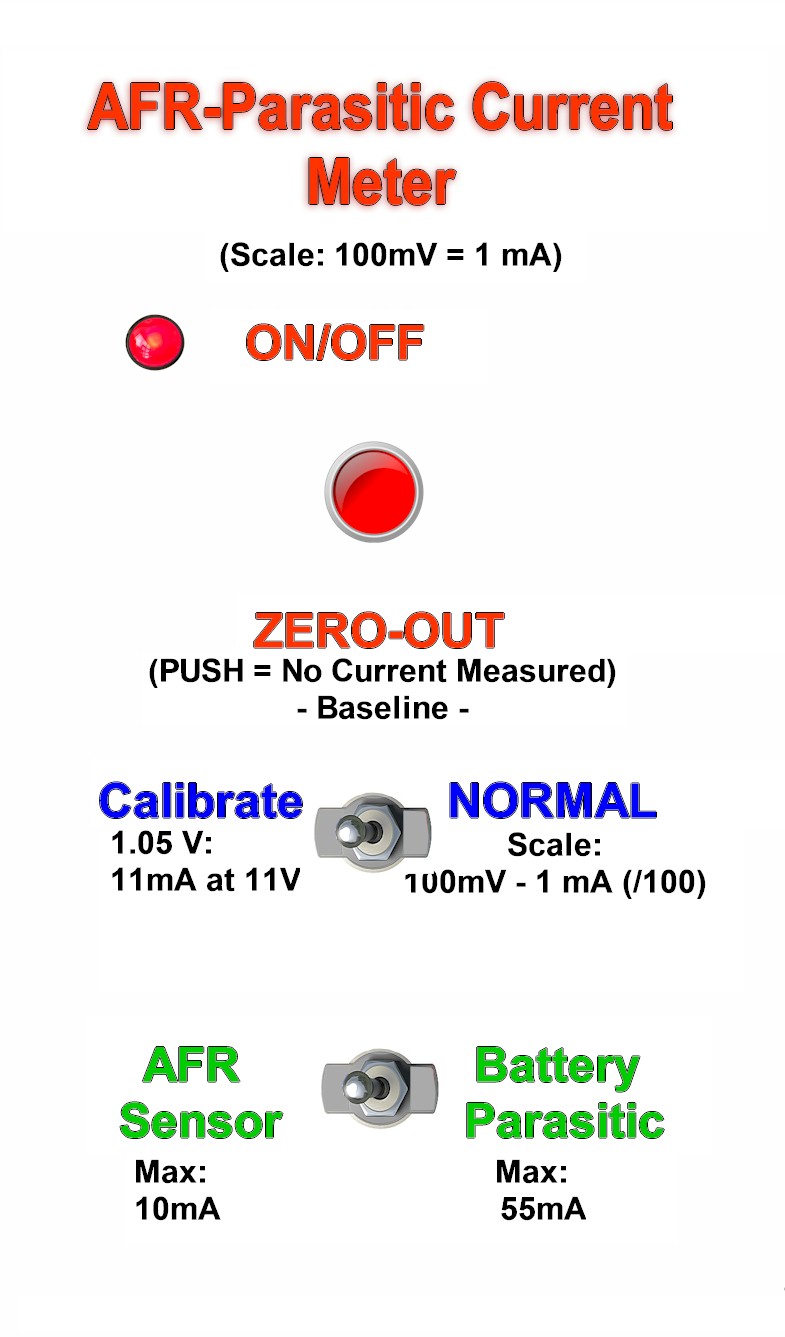The AFR Tester can also be used to test parasitic battery current draws. Yes, those that discharge the battery over night. It works by converting the tiny current draw into a voltage that the Voltmeter can measure. (Click here for our companion website article on AFR sensors).